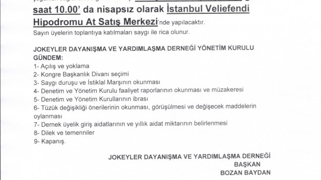 JOKEYLER DAYANIŞMA VE YARDIMLAŞMA DERNEĞİ SAYIN ÜYELERİNE DUYURULUR