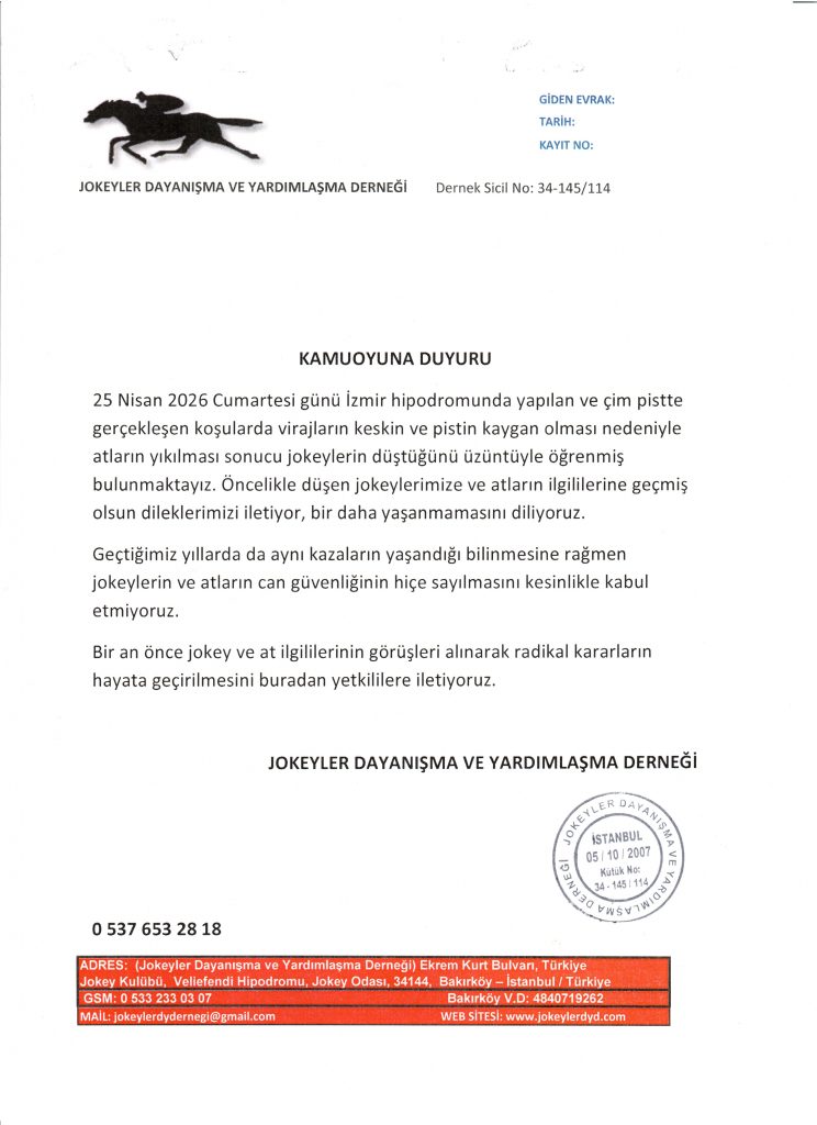 25 Nisan 2026 Cumartesi günü İzmir hipodromunda yapılan ve çim pistte gerçekleşen koşularda virajların keskin ve pistin kaygan olması nedeniyle atların yıkılması sonucu jokeylerin düştüğünü üzüntüyle öğrenmiş bulunmaktayız. Öncelikle düşen jokeylerimize ve atların ilgililerine geçmiş olsun dileklerimizi iletiyoruz.