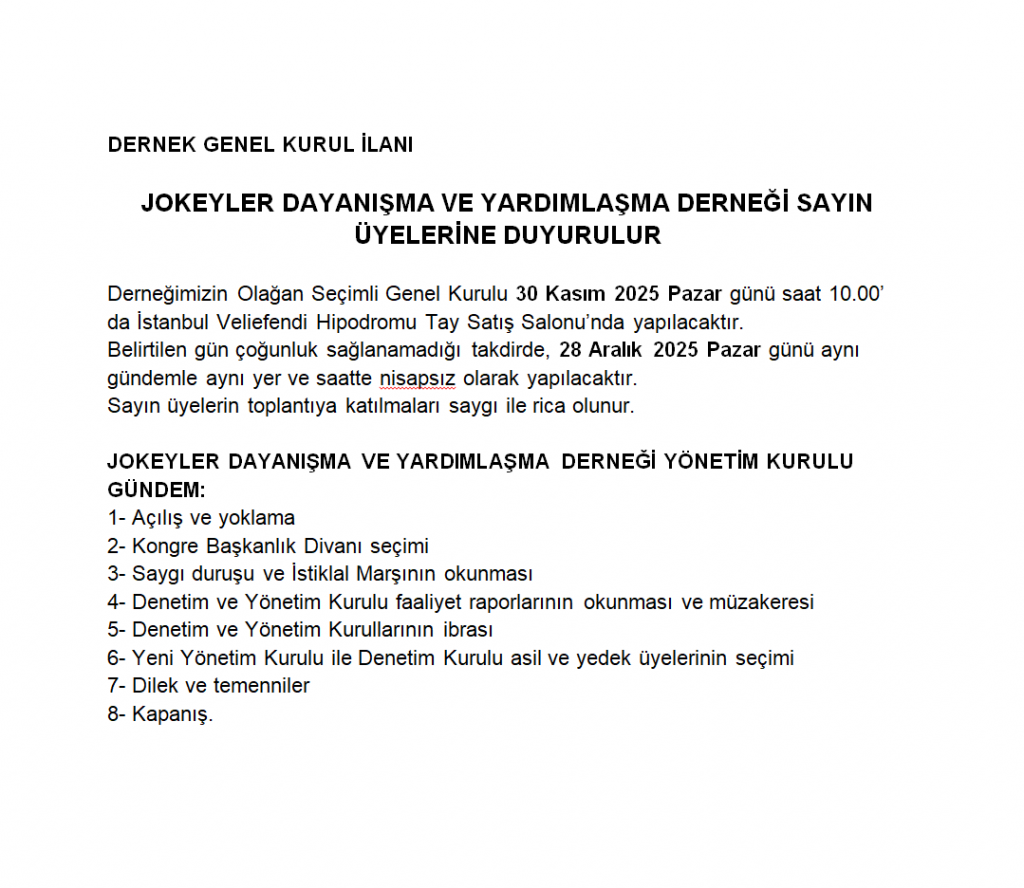 JOKEYLER DAYANIŞMA VE YARDIMLAŞMA DERNEĞİ SAYIN ÜYELERİNE DUYURULUR
